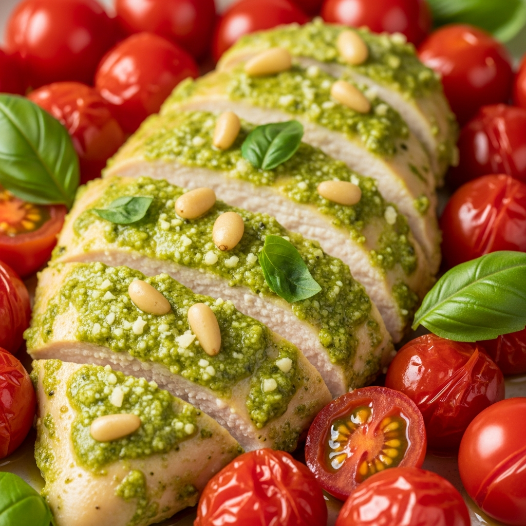 Homemade pesto using basil, pine nuts, and olive oil is a nutritional powerhouse. Pairing it with chicken and roasted cherry tomatoesโwhich release lycopene when cookedโcreates a meal that supports heart health and reduces cellular damage.