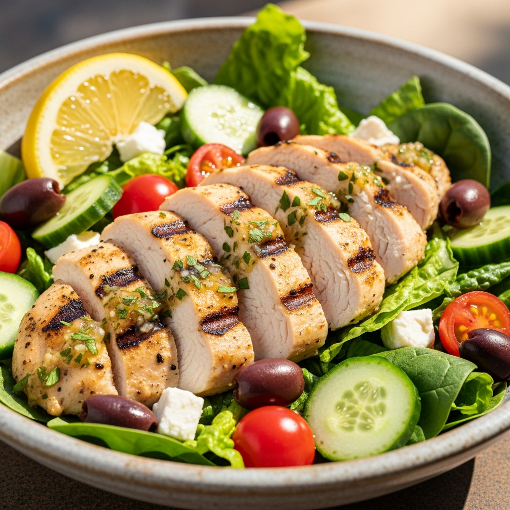Mediterranean flavors are naturally anti-inflammatory. This salad combines grilled chicken breast with extra virgin olive oil, fresh lemon juice, and a variety of herbs like oregano and parsley. The inclusion of cucumbers and olives provides healthy fats and hydration.