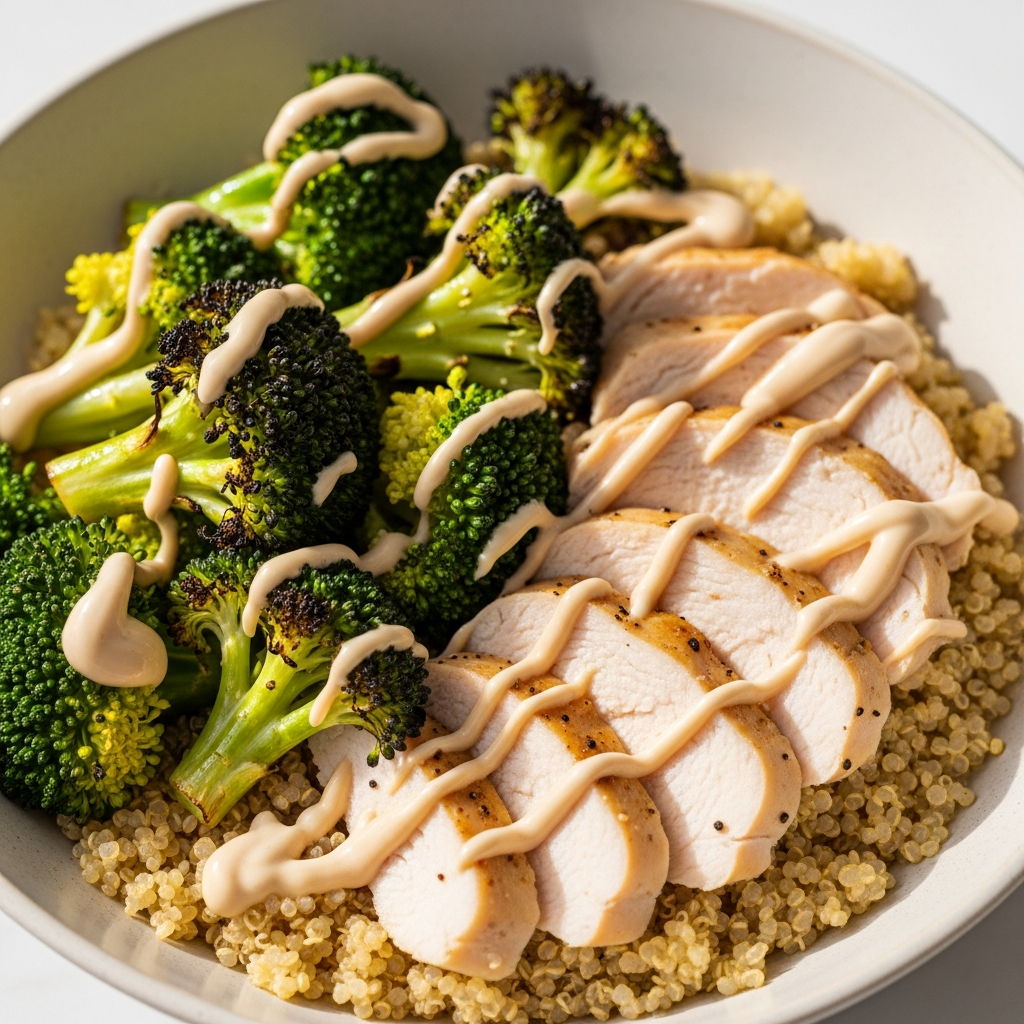 Quinoa is a gluten-free ancient grain that provides a complete protein source. Combined with sliced chicken, steamed broccoli, and a drizzle of tahini, these bowls offer a high-fiber meal that keeps energy levels stable and inflammation low.