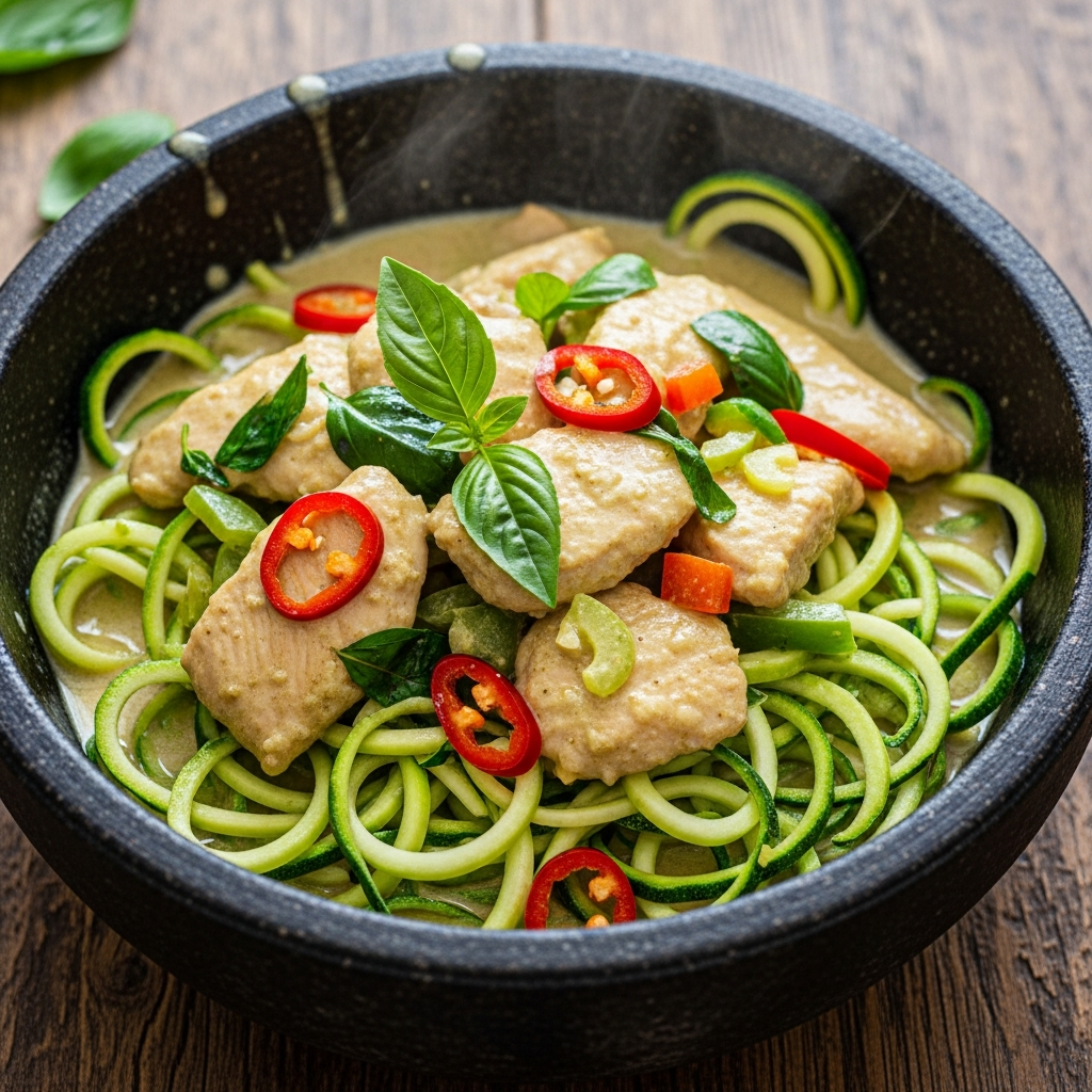 Traditional green curry uses coconut milk and a variety of spices that soothe the gut. By swapping traditional rice noodles for zucchini noodles (zoodles), you reduce the glycemic load of the meal, making it even better for clean eating.