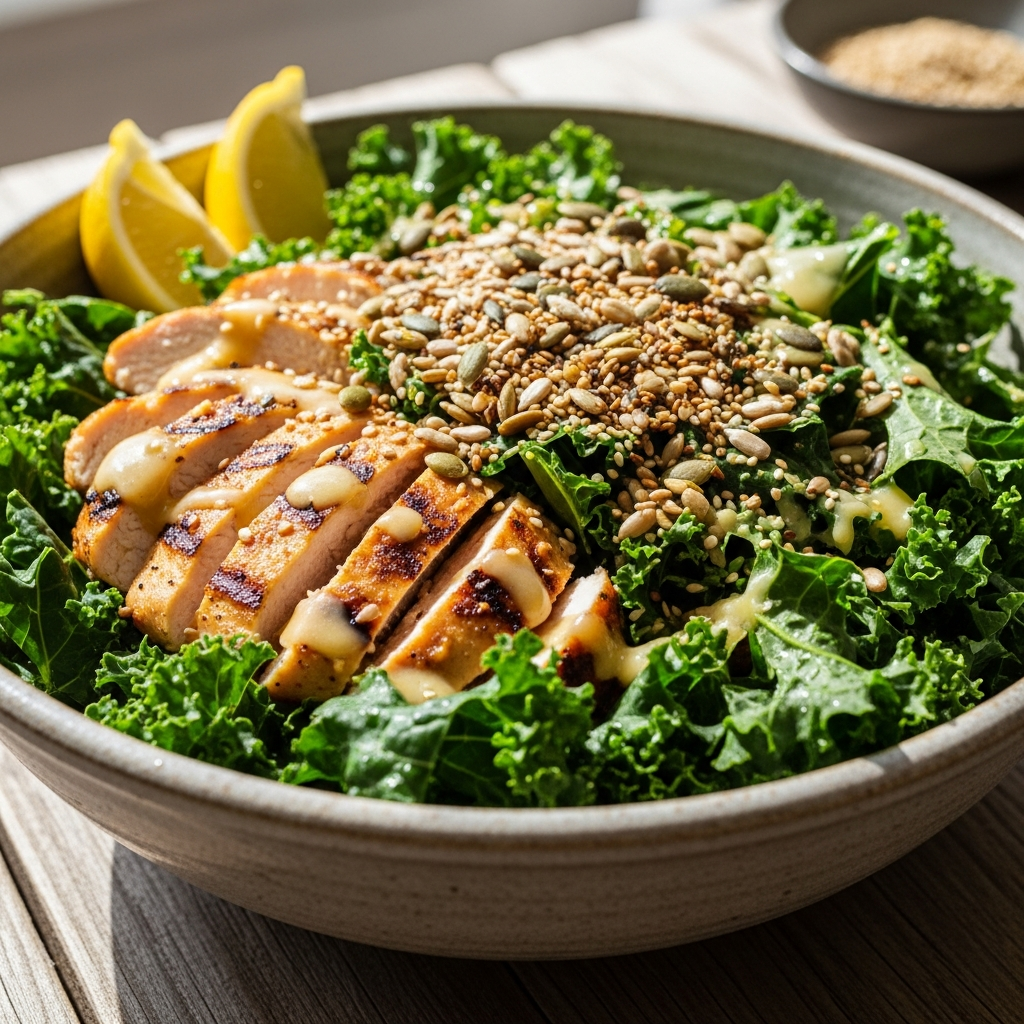 Kale is one of the most nutrient-dense foods on the planet. Massaging the kale with olive oil makes it easier to digest, and adding grilled chicken makes it a complete, high-protein meal that promotes detoxification.