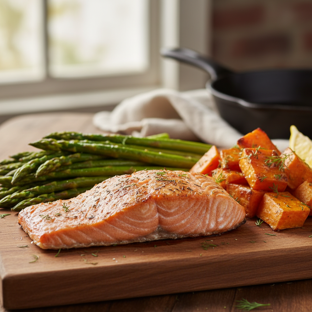 • Sheet Pan Salmon and Veggies: Salmon fillets roasted with broccoli florets, sweet potato chunks, and olive oil.