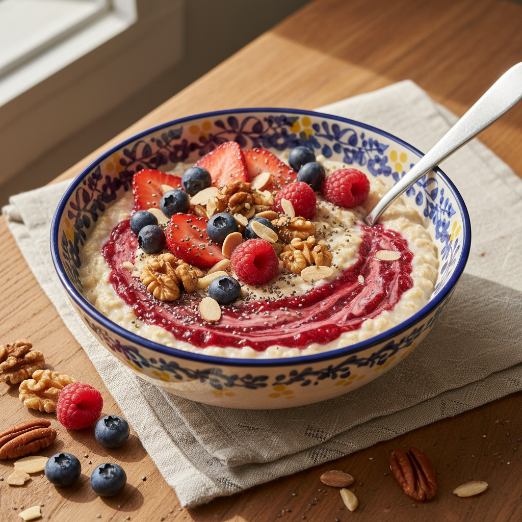 • Overnight Oats: Rolled oats soaked in almond milk with chia seeds, topped with berries and walnuts.