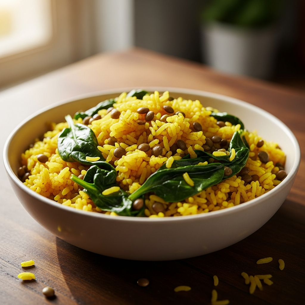 Lentils are among the most affordable plant proteins available. Cooking dried red or green lentils directly with your rice and a teaspoon of turmeric creates a vibrant, nutrient-dense base. Fold in fresh spinach at the end of the cooking process to add iron and vitamins. This dish is naturally vegan but remains high in protein and very low in cost per serving.