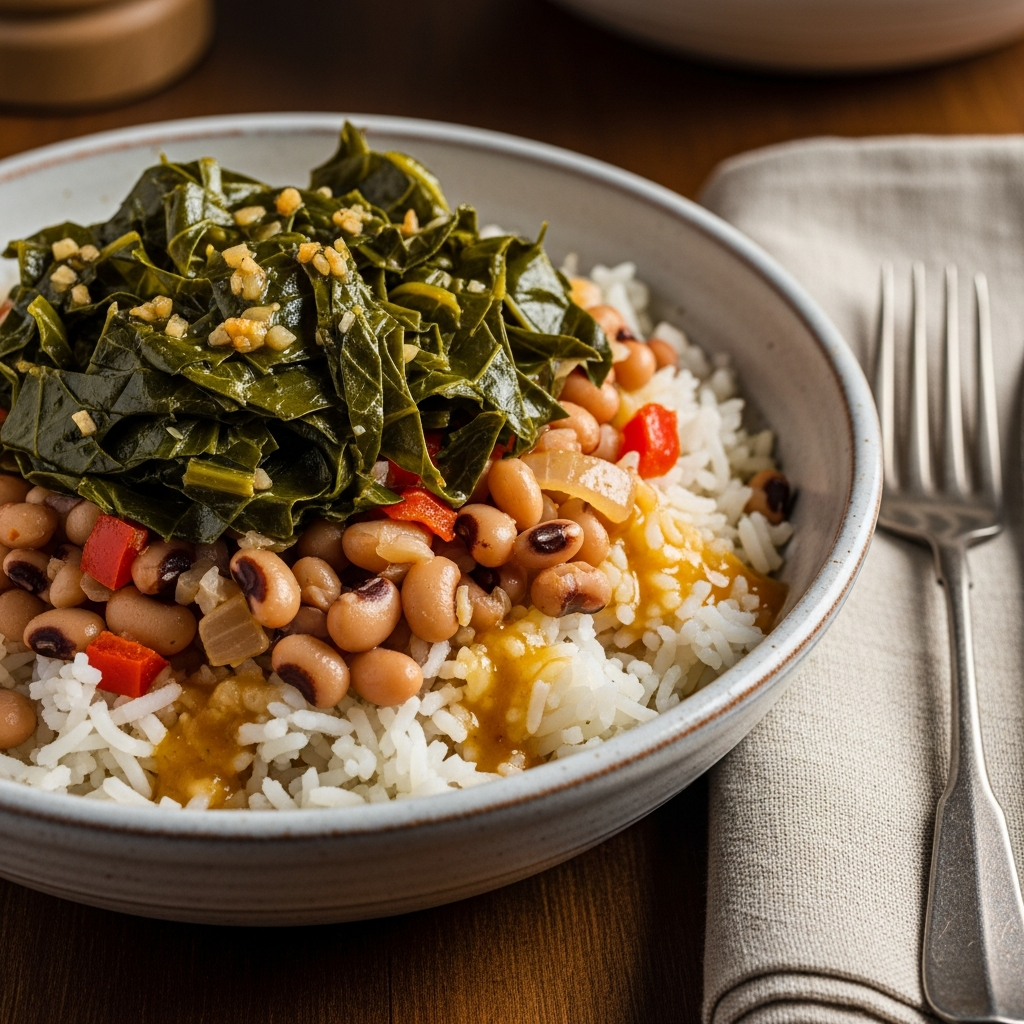 Inspired by Southern tradition, this meal uses dried black-eyed peas which are incredibly cheap when bought in bags. Slow-cook the peas with smoked paprika and garlic, then serve with sautรฉed collard greens over rice. This combination offers a significant amount of plant protein and a wide range of micronutrients.
