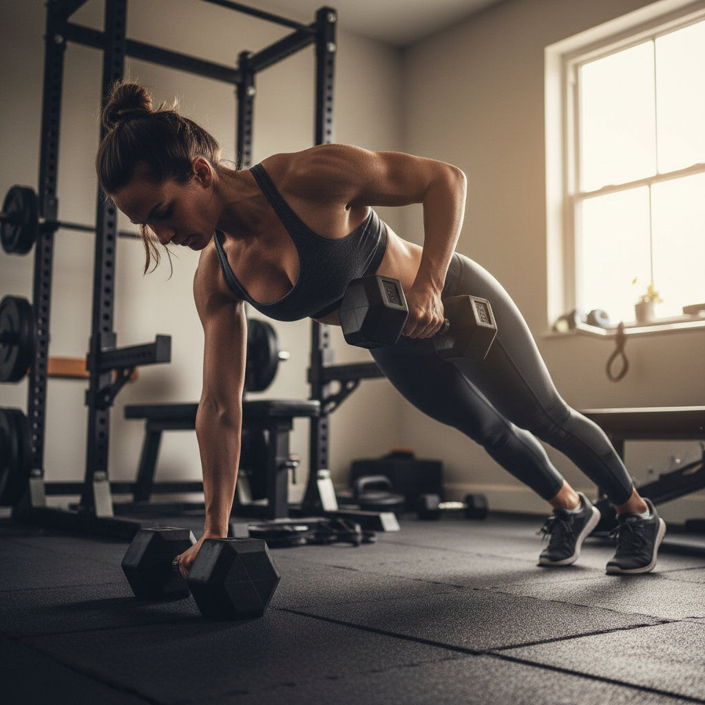 - How Toย Start in a high plank position with hands on dumbbells, feet wider than shoulder-width. Keep your body stable and row one dumbbell towards your chest, squeezing your shoulder blade. Lower with control and repeat on the other side.