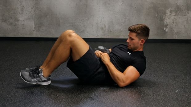 - Sit on the floor, knees bent, holding one dumbbell.