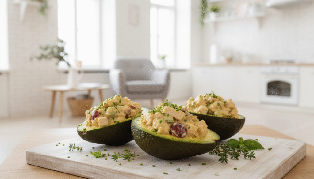 Cut an avocado in half, remove the pit, and fill the center with chicken salad. Itโs creamy, filling, and beautiful enough for guests.