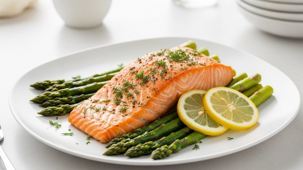 Bake salmon and asparagus at 400ยฐF for 12โ15 minutes. Add lemon juice before serving.