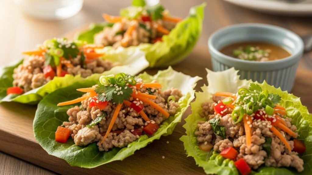 Cook turkey with onions and peppers, season lightly, and spoon into lettuce leaves.