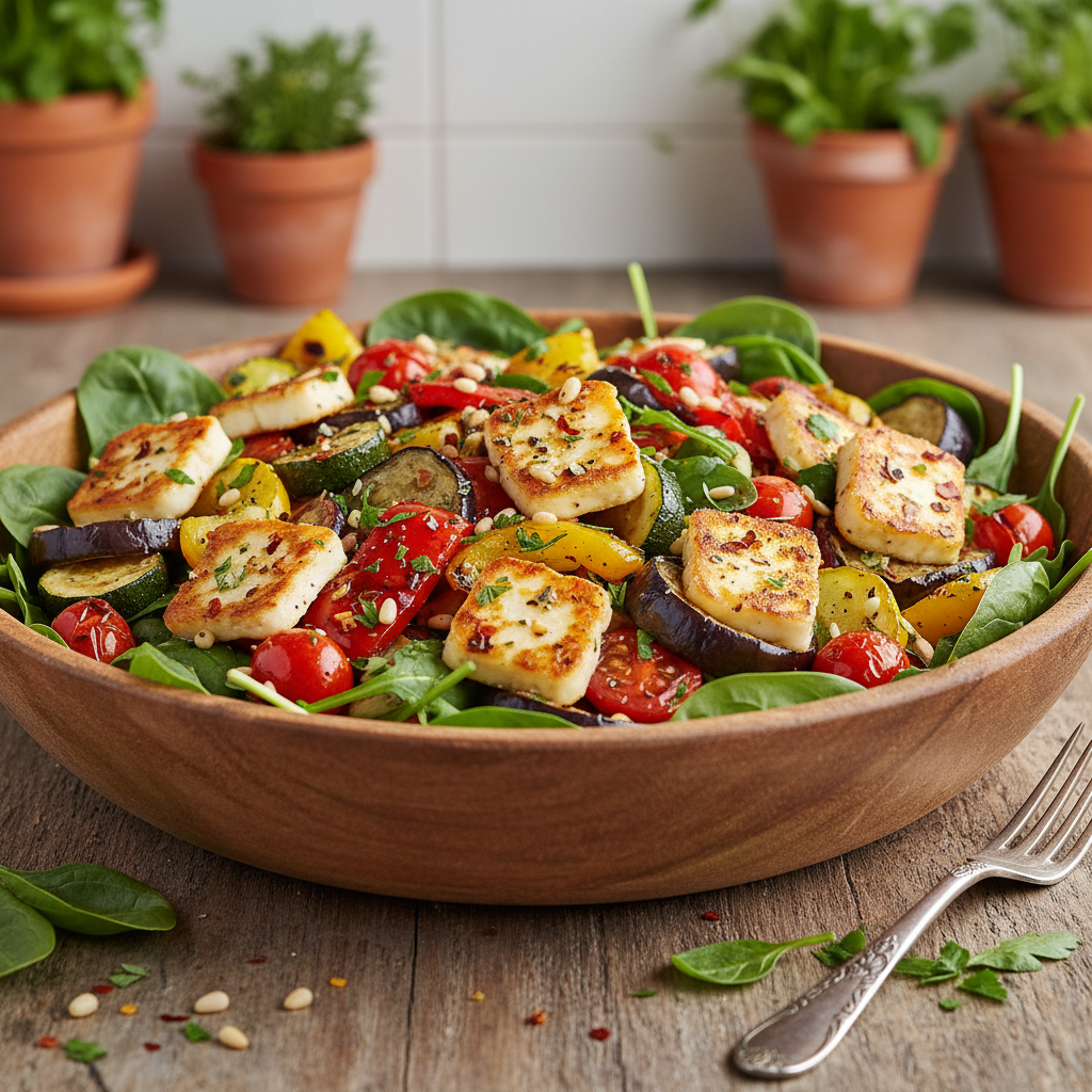 - Halloumi and Roasted Vegetable Saladย Grill or pan-fry halloumi cheese and serve it over a bed of mixed greens with roasted zucchini, bell peppers, and cherry tomatoes.
