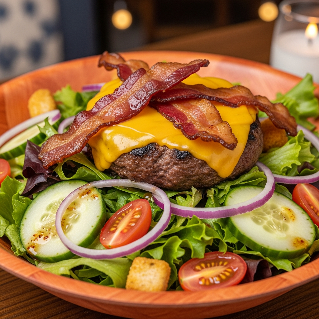 Enjoy the flavors of a cheeseburger by placing a grilled beef patty on a bed of romaine lettuce. Add bacon, cheddar cheese, pickles, and tomatoes. Use a mustard-based dressing to keep the meal high in protein and fats while avoiding the carbohydrates found in a traditional bun.