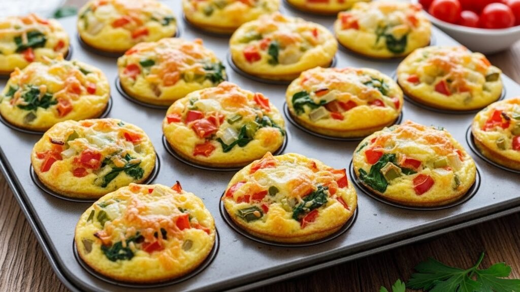 Whisk eggs, add veggies and cheese, and bake in muffin molds.