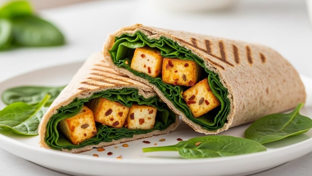 Fill a whole-grain wrap with sautรฉed paneer, spinach, and light seasoning.
