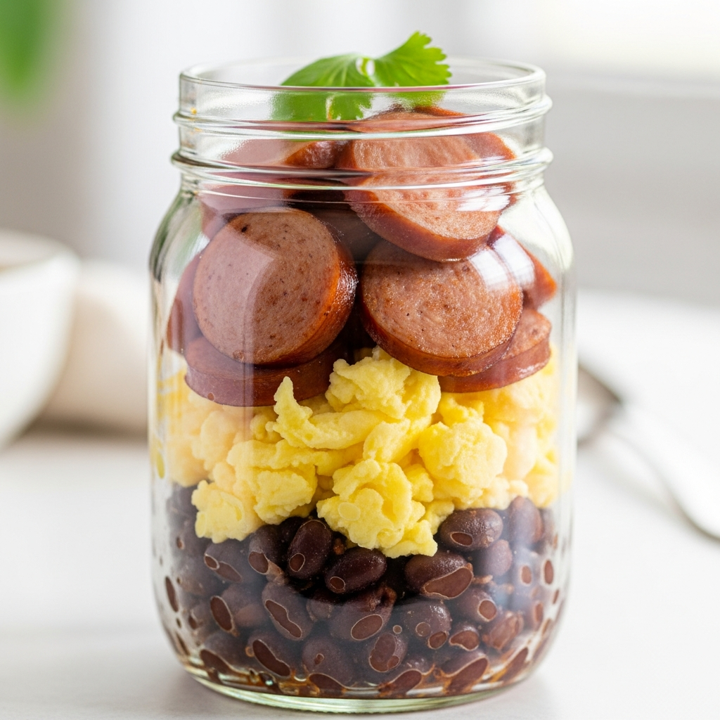 Layer your favorite breakfast ingredients in a glass jar to keep them fresh. Start with a layer of black beans, followed by scrambled eggs, cooked turkey sausage, and a sprinkle of cheese. In the morning, you can heat the contents and wrap them in a tortilla or eat them straight from the jar with a fork.