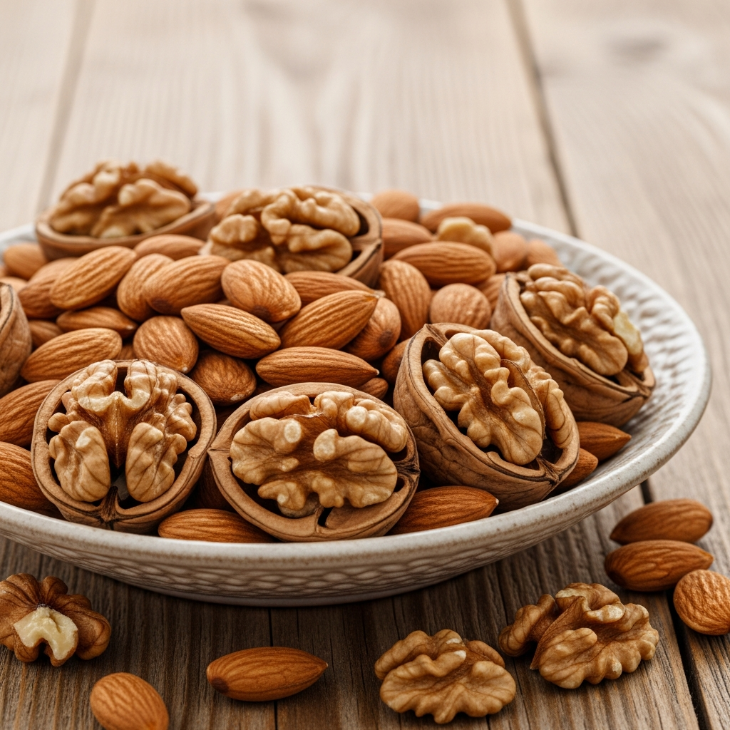 Almonds provide protein and vitamin E, an antioxidant that protects delicate hormone-producing glands. Walnuts contribute plant-based omega-3s. Together, they help manage insulin sensitivity. Consuming nuts as a snack has been shown to improve the lipid profile, which is necessary for the production of steroid hormones.