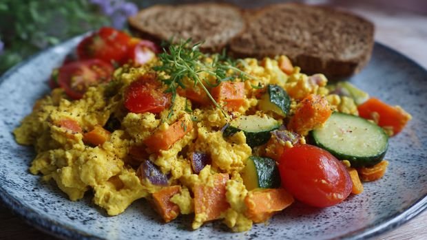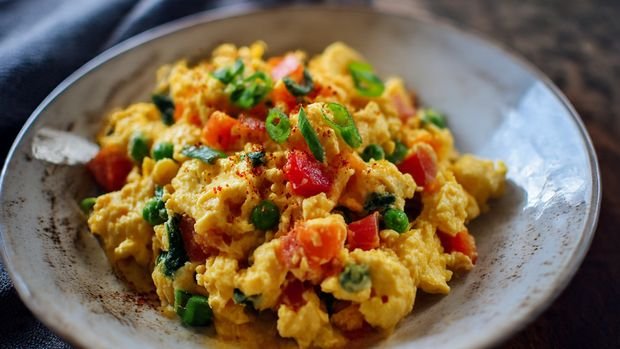 Crumble tofu in a pan, season with turmeric, garlic, and salt, and sautรฉ with your favorite vegetables.