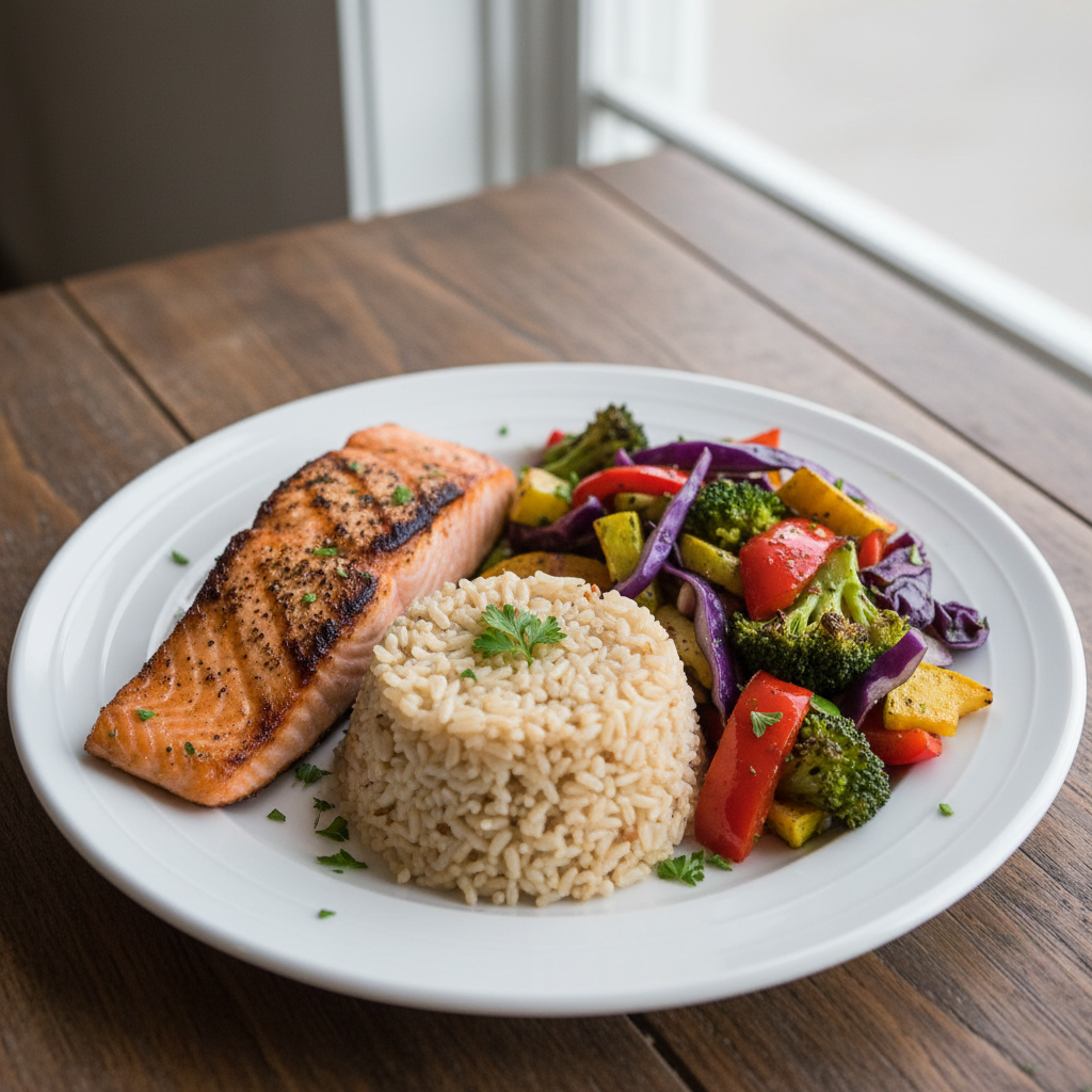 - Dinnerย Baked salmon with roasted vegetables and quinoa
