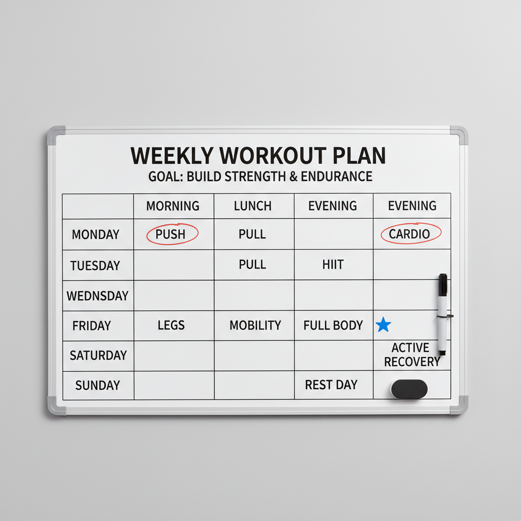 • Cool-down (5-10 minutes):ย Static stretches, holding each for 20-30 seconds (quad stretch, hamstring stretch, glute stretch, calf stretch).