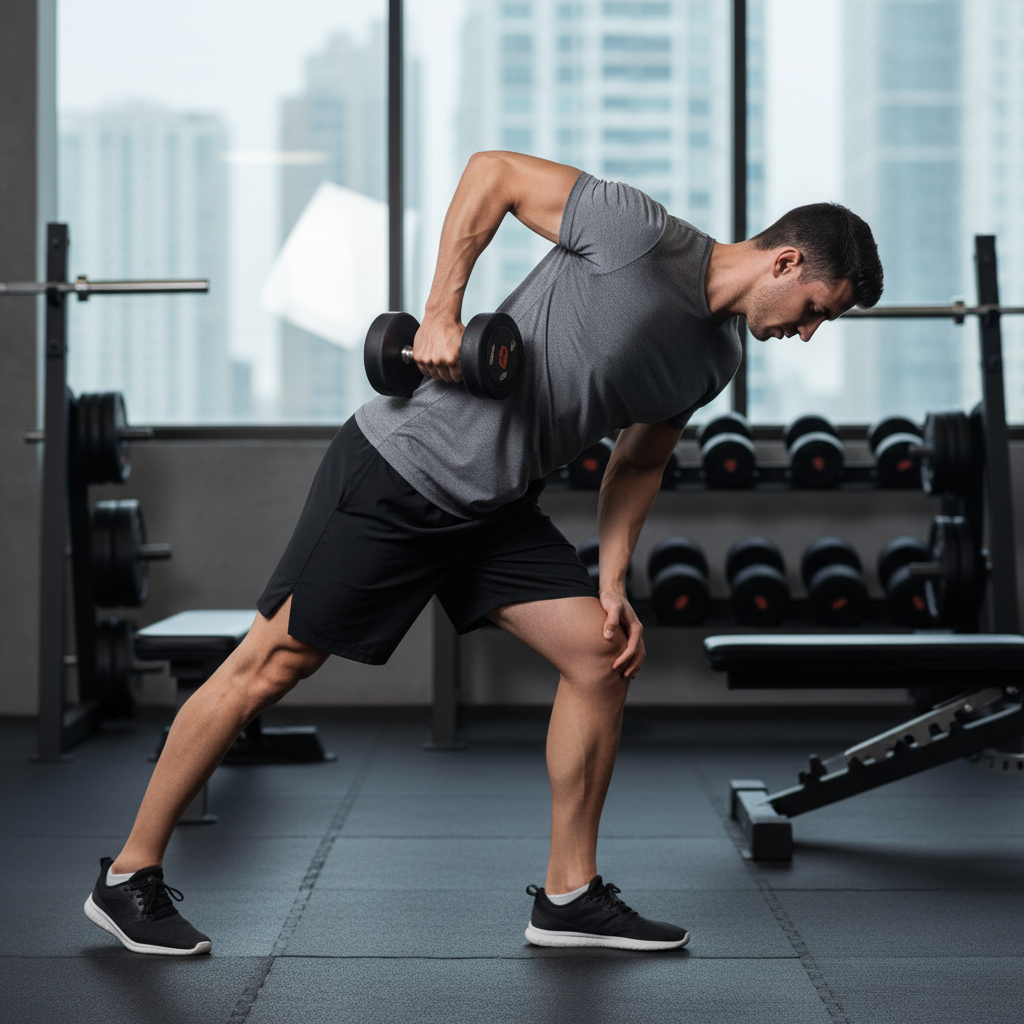 1. Setupย Stand with your feet shoulder-width apart, holding a dumbbell in one hand. Hinge at your hips, keeping your back flat and core engaged, until your torso is nearly parallel to the floor. Your working arm’s elbow should be bent at 90 degrees, upper arm tucked close to your side and parallel to the floor.