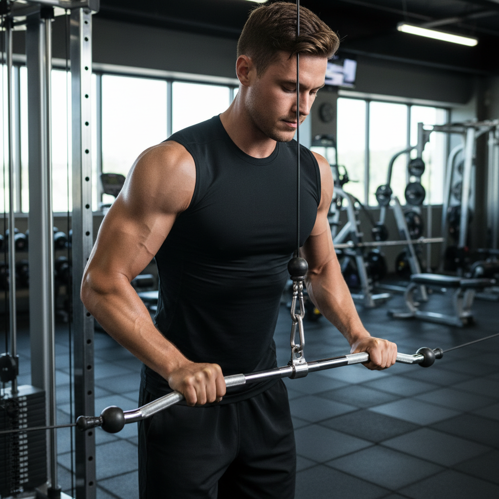 1. Stand facing a cable machine, gripping a straight bar or rope attachment with an overhand grip, hands about shoulder-width apart.